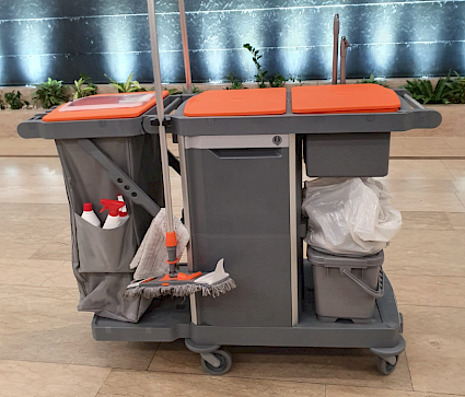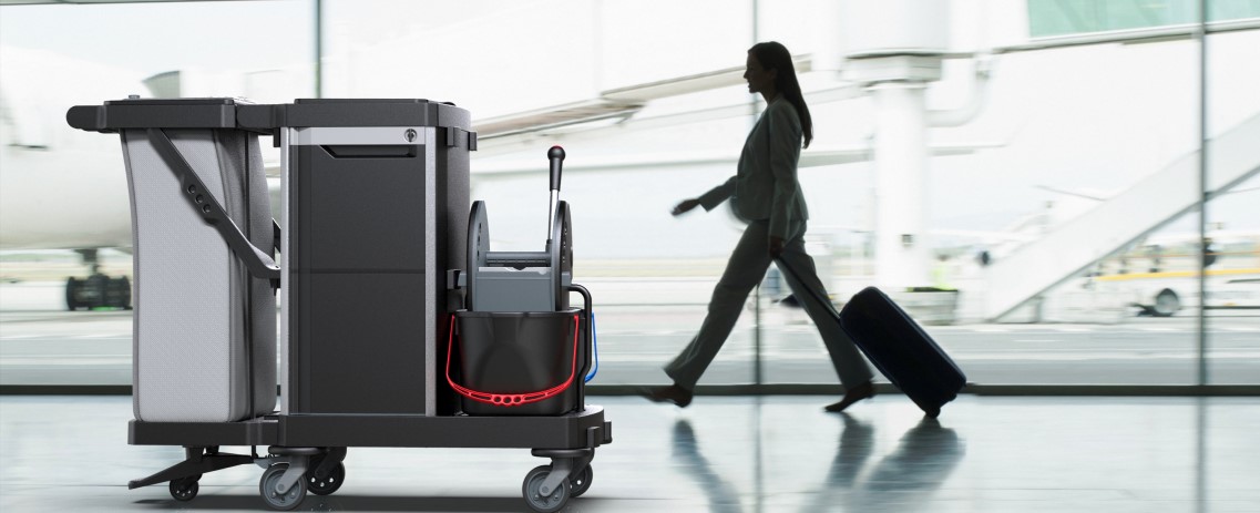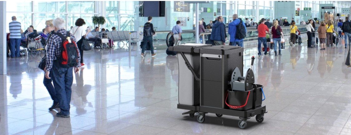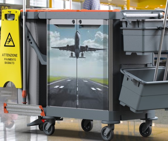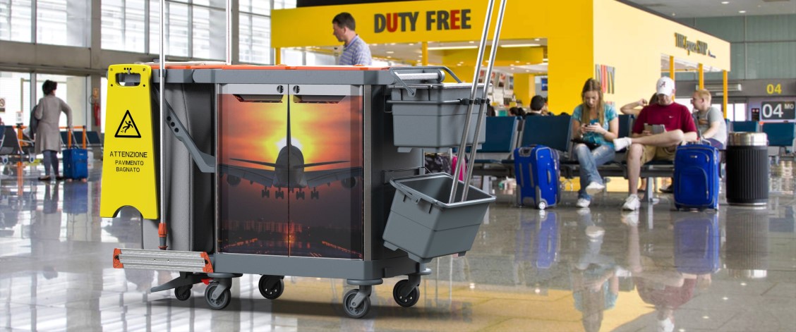 Tools and the cleaning services must answer to many needs on these public areas . First, the cleaning is carried out in the presence of public in different spaces: from the large public areas, often connected by long corridors, to the dining areas; from shops to toilets. Therefore, the equipment must be adapted to any type of environment so as to make the airport or the station comfortable, safe and clean. Tidiness is relevant and if it is not managed with order and efficiency, respecting the travellers’ high standard, it has a negative effect on the image of the structure. The equipment is seen by many people, so their appearance must be good. This is important especially for trolleys, whose panels can be finished with images or logos associated with the company's name.