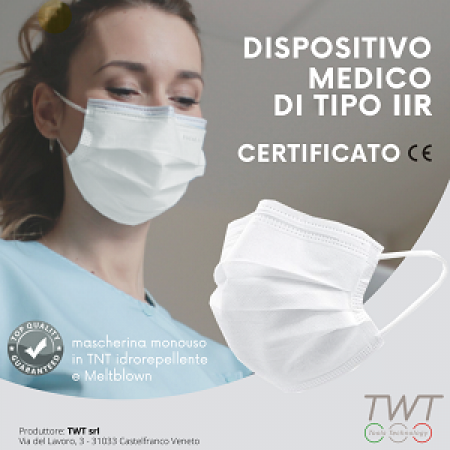 The disposable surgical mask of TWT srl is an high quality medical device, used in protocols to reduce the risk of spreading infections - in particular during the current COVID-19 emergency.