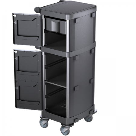 Available whole doors or half doors that open at 270° for greater practicality in use, they can be closed with the special key, guaranteeing maximum safety and hygiene to the trolley and an always tidy appearance. The particularly sturdy base and the series of wheels designed and built in TWT guarantee the trolley always a simple, easy, silent mobility even with heavy loads or in the presence of carpets