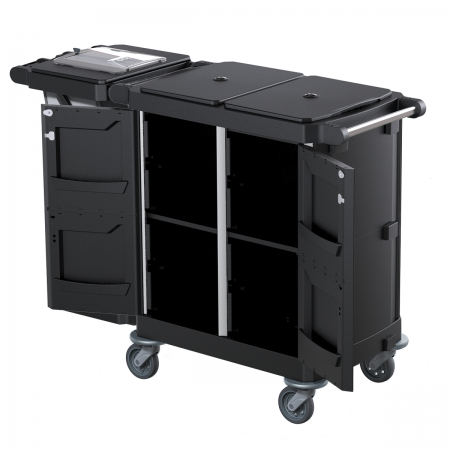 Available whole doors or half doors that open at 270° for greater practicality in use, they can be closed with the special key, guaranteeing maximum safety and hygiene to the trolley and an always tidy appearance. The particularly sturdy base and the series of wheels designed and built in TWT guarantee the trolley always a simple, easy, silent mobility even with heavy loads or in the presence of carpets