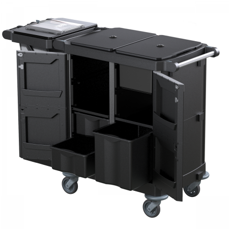 Available whole doors or half doors that open at 270° for greater practicality in use, they can be closed with the special key, guaranteeing maximum safety and hygiene to the trolley and an always tidy appearance. The particularly sturdy base and the series of wheels designed and built in TWT guarantee the trolley always a simple, easy, silent mobility even with heavy loads or in the presence of carpets