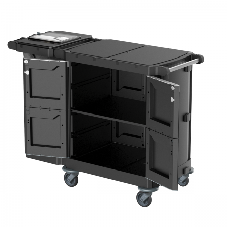 • Available whole doors or half doors that open at 270° for greater practicality in use, they can be closed with the special key, guaranteeing maximum safety and hygiene to the trolley and an always tidy appearance. The particularly sturdy base and the series of wheels designed and built in TWT guarantee the trolley always a simple, easy, silent mobility even with heavy loads or in the presence of carpets