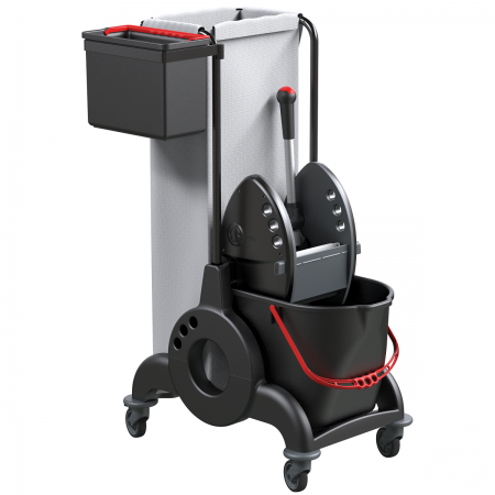 GIOTTO R TOP BIN 2 - base ReUse con ruote in metallo Ø80mm e paracolpi Ø90mm. 1 secchio Lt 25 in PP ReUse, strizzatore Prexa nero, 1 secchiello Lt 7 in PP ReUse30x16xh23 cm, 1 supporto secchiello girevole. Maniglia centrale portasacco. Optional: Sacco Lt 90 plastificato