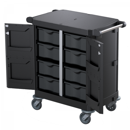 Disponibile con porte intere o mezze porte che si aprono a 270° per una maggiore praticità durante l'utilizzo. Sono dotate di chiusura a chiave per garantire al carrello la massima sicurezza ed igiene ed un aspetto ordinato. La base particolarmente robusta e le ruote, Ø125mm Silent Wheel, progettate e costruite in TWT conferiscono al carrello una maggiore agilità e silenziosità anche con carichi pesanti o in presenza di moquettes