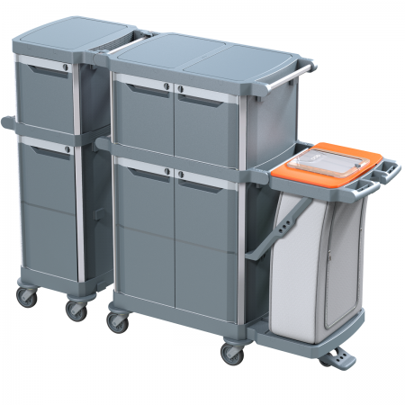 Carrello di servizio indicato nel mondo degli hotel per la gestione delle camere. Il carrello Van è dotato di un secondo modulo che permette di servire grandi spazi, grazie al suo sistema brevettato basta una semplice pressione sugli appositi attacchi per sganciare e agganciare il carrello dai diversi moduli. In questo modo viene facilitata l'entrata e l'uscita dalle stesse camere senza ingombri. Opera Van permette di servire 17 camere complete