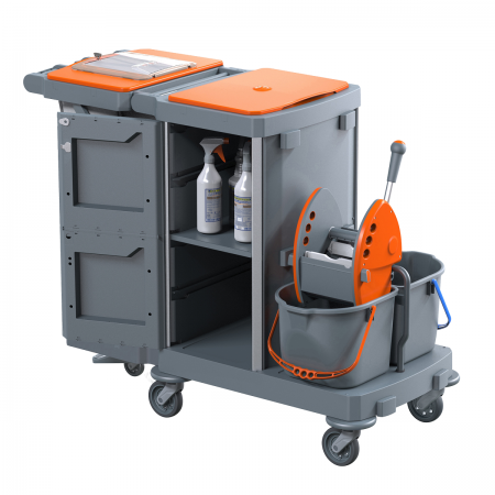 Ideale per ambienti che richiedono il lavaggio e lo spolvero dei pavimenti e delle altre superfici. Tutto ciò è disponibile in un unico carrello