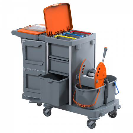 Ideale per ambienti che richiedono il lavaggio e lo spolvero dei pavimenti e delle altre superfici, tutto ciò è disponibile in un unico carrello