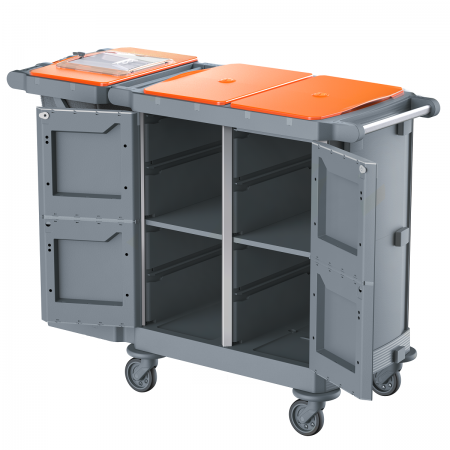 Disponibile con porte intere o mezze porte che si aprono a 270° per una maggiore praticità durante l'utilizzo. Sono dotate di chiusura a chiave per garantire al carrello la massima sicurezza ed igiene ed un aspetto ordinato. La base particolarmente robusta e le ruote, Ø125mm Silent Wheel, progettate e costruite in TWT conferiscono al carrello una maggiore agilità e silenziosità anche con carichi pesanti o in presenza di moquettes