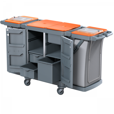 Carrello per il trasporto e la gestione dei prodotti e dell'attrezzatura per la pulizia nei diversi ambienti operativi